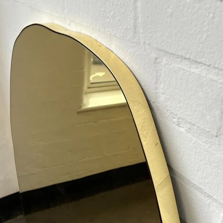 Bespoke freeform gold tinted mirror with a solid polished brass minimalist frame for a private home in Norway.